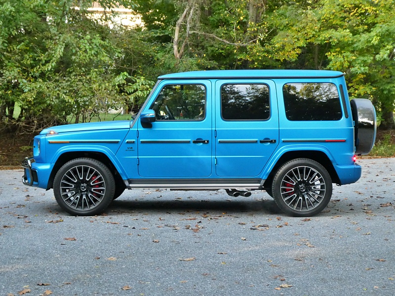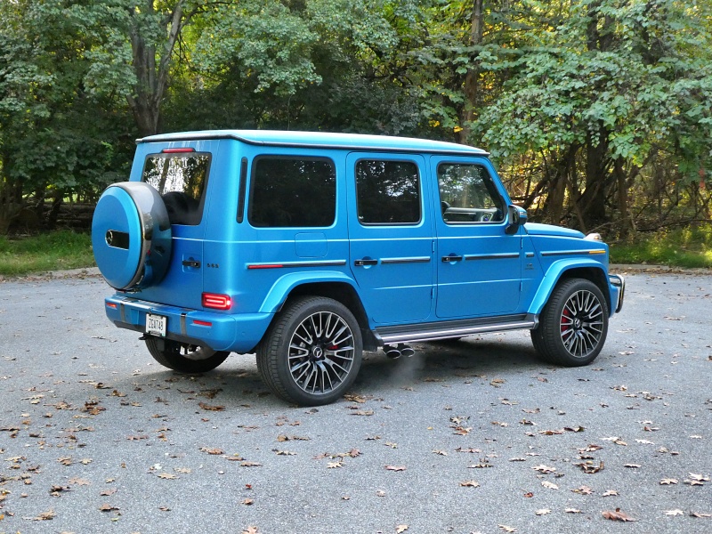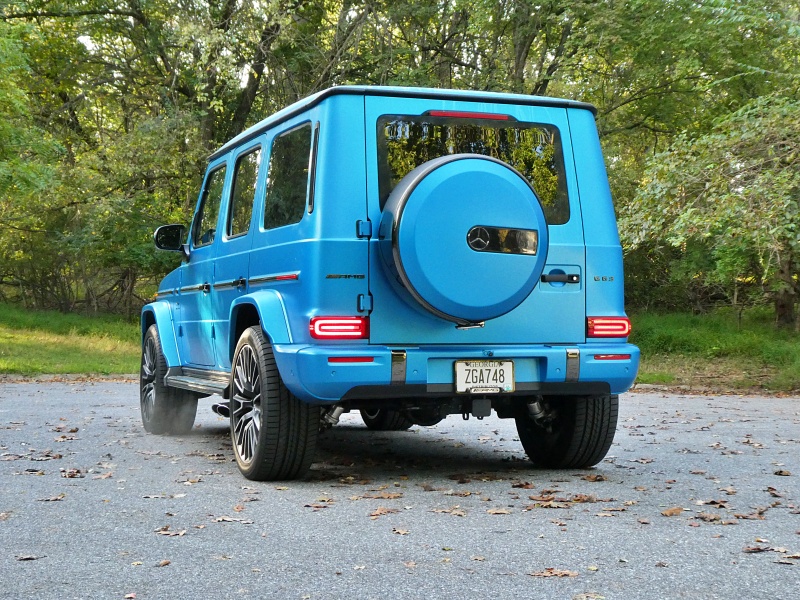 If you still want eight cylinders, don’t worry. You can still get the 4.0-liter V8 in the G 63 AMG like our test vehicle. In this case, it’s boosted to 577 hp and 627 lb-ft of torque – good for a sonorous 4.2-second sprint to 60 mph. The quad exhaust pipes stick out of the G-Wagen’s side, just before the rear wheel, to make sure you don’t miss the burble. The EPA projects 15 mpg in mixed driving (up 1 mpg from last year, thanks to the AMG’s own new mild-hybrid assistance). We averaged 18 mpg in mostly highway driving.