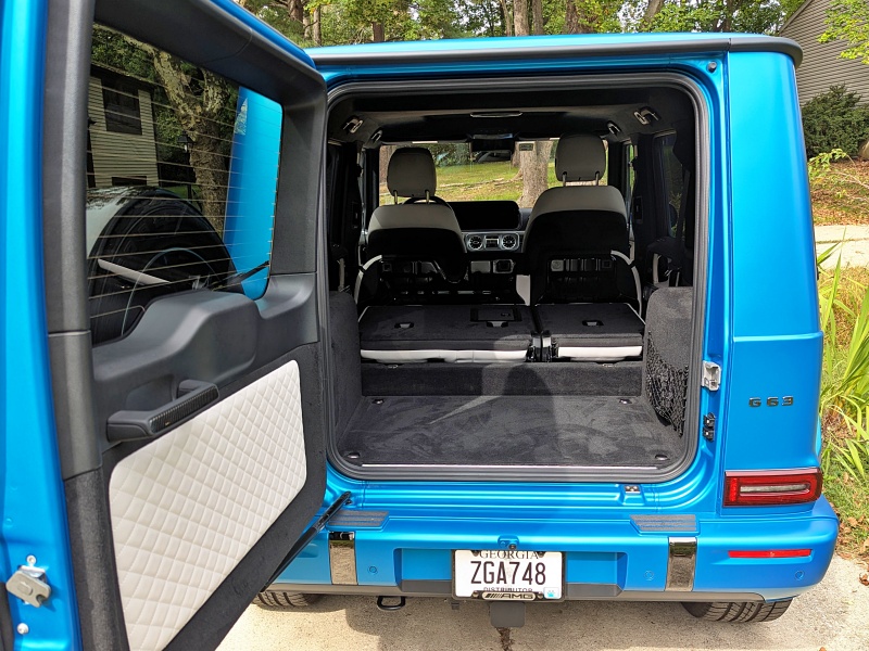 The G-Class’s rear seat folds down in two steps, with the cushion tipping forward before the seatback can drop down. The folded rear seat is up on a ledge several inches above the cargo floor, so you don’t get a flat surface. Total cargo volume measures 69 cubic feet – a little bit less than the GLE. This isn’t a tiny cargo hold, but you can’t take four friends camping and effortlessly toss everyone’s gear in the back. You can tow a trailer weighing up to 7,716 pounds, more than most SUVs.