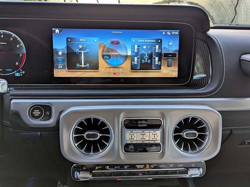 It still rides on a truck-like body-on-frame platform, rather than a unibody (with the chassis and body integrated into a single unit). It includes four-wheel drive with low range; locking front, rear, and center differentials; three speeds of crawl control; and a solid rear axle. It has 9.5 inches of ground clearance and can ford 27.5 inches of standing water. You can select Sand, Trail, and Rock off-road driving modes, but unlike a modern Range Rover, the G-Class’s off-road performance isn’t based on software trickery or spiffy air suspensions that lift the body up over obstacles. It’s old-fashioned mechanical hardiness.